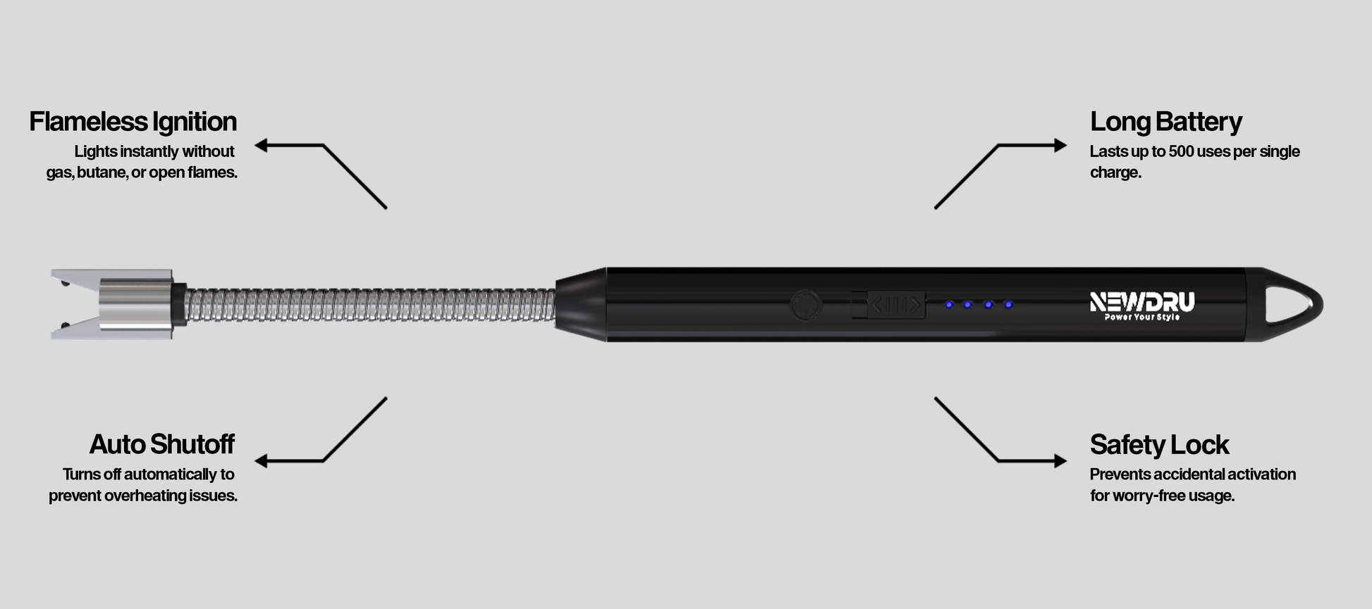 - Multipurpose - The electric lighter came fully charged and ready to use, straight out of the box. Perfect for camping, kitchen, candles, stoves, barbecue, grill, gas appliances, gas cooker, oil burners, gas hob, fireplaces, fireworks